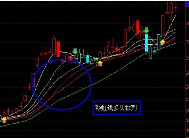 二、指標。調出指標、智能輔助線、慧眼K線、均線,出現七彩虹,如下圖。