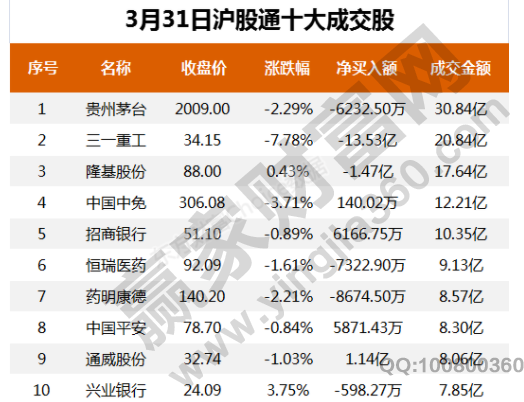 滬港通十大成交股中,數據顯示,通威股份獲得北向資金大幅凈買入,資產達到1.14億元,招商銀行凈買入資金達到6166.75萬,三一重工凈賣出資金達到13.53億元。